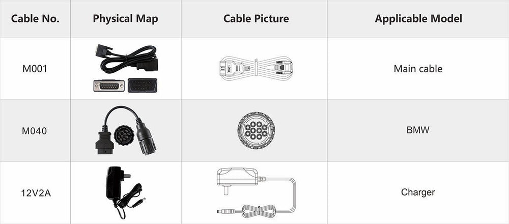 Im Set enthalten ist alles, was Sie für den direkten Start benötigen. Das Hauptkabel verbindet das Tablet mit dem Diagnosestecker, das BMW-Spezialkabel bildet die passende Schnittstelle zum Fahrzeug. Das Ladegerät hält das System einsatzbereit, während die Software bereits so vorbereitet ist, dass Sie nach der Ersteinrichtung mit der Arbeit beginnen können. Optionales Zubehör wie zusätzliche Adapter ist modellabhängig sinnvoll und richtet sich nach Ihrem Fuhrpark bzw. Kundenkreis.