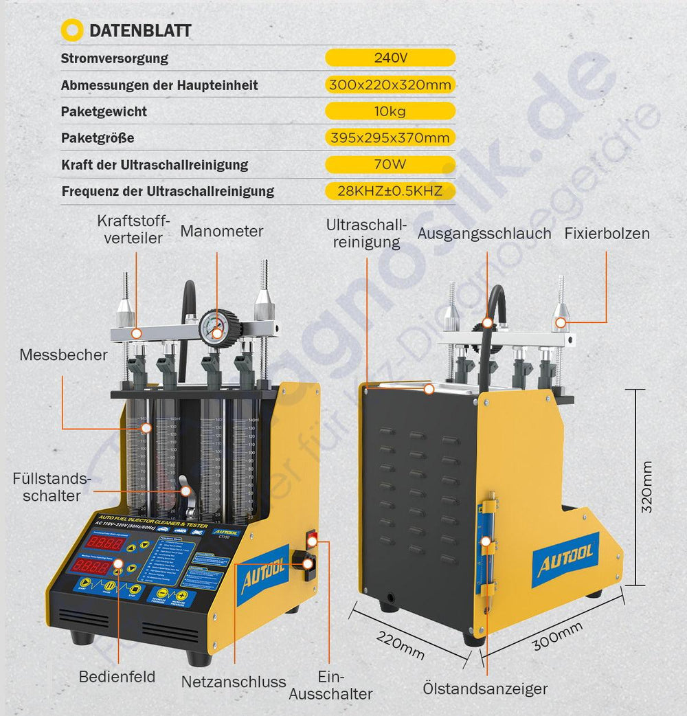 The AUTOOL CT150 Injector Tester is a professional 4-cylinder testing and cleaning machine specially designed for the maintenance and care of injectors in gasoline vehicles and motorcycles. With its versatile functions, including an ultrasonic cleaning system and precise testing capabilities, the CT150 Injector Tester is the ideal tool for workshops and experienced vehicle owners. Note: Not suitable for diesel.