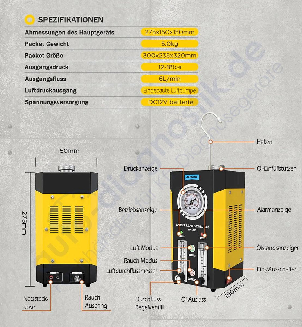 Der Rauchleck Detektor SDT 206 ist ein unverzichtbares Werkzeug zur Diagnose von Lecks in Fahrzeugen. Mit seiner schnellen Raucherzeugung, seiner Vielseitigkeit und seiner benutzerfreundlichen Bedienung erfüllt er die Anforderungen von Profis und Hobbymechanikern gleichermaßen. Vertrauen Sie auf den Rauchleck Detektor, um Lecks schnell und präzise zu finden und Reparaturkosten zu senken!